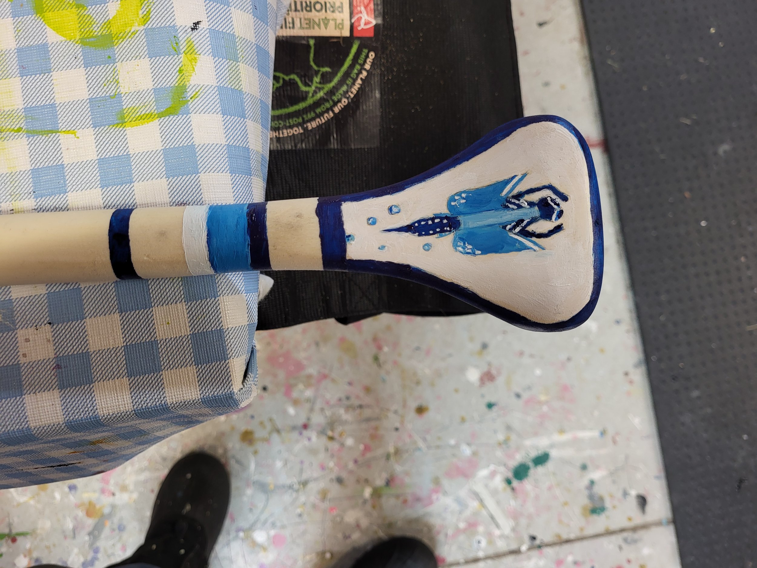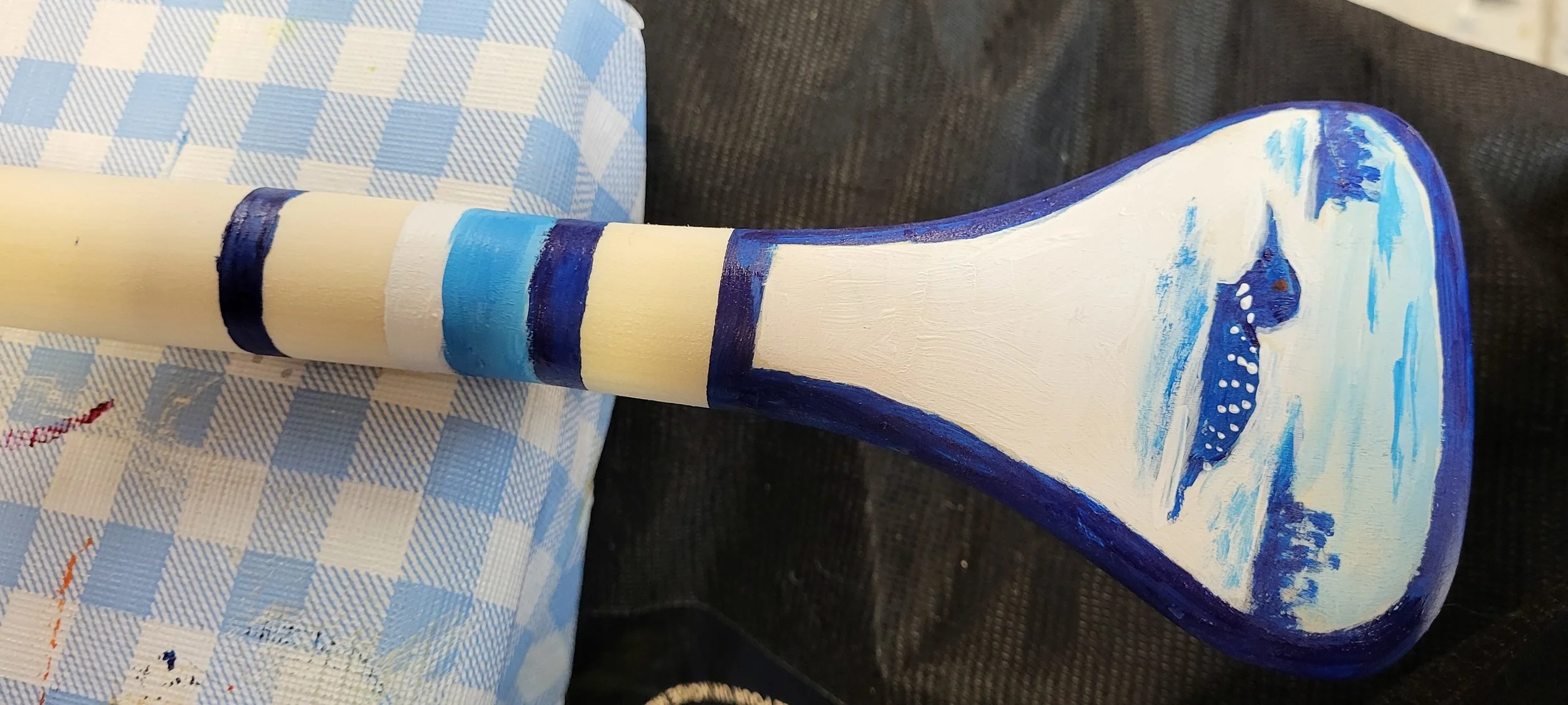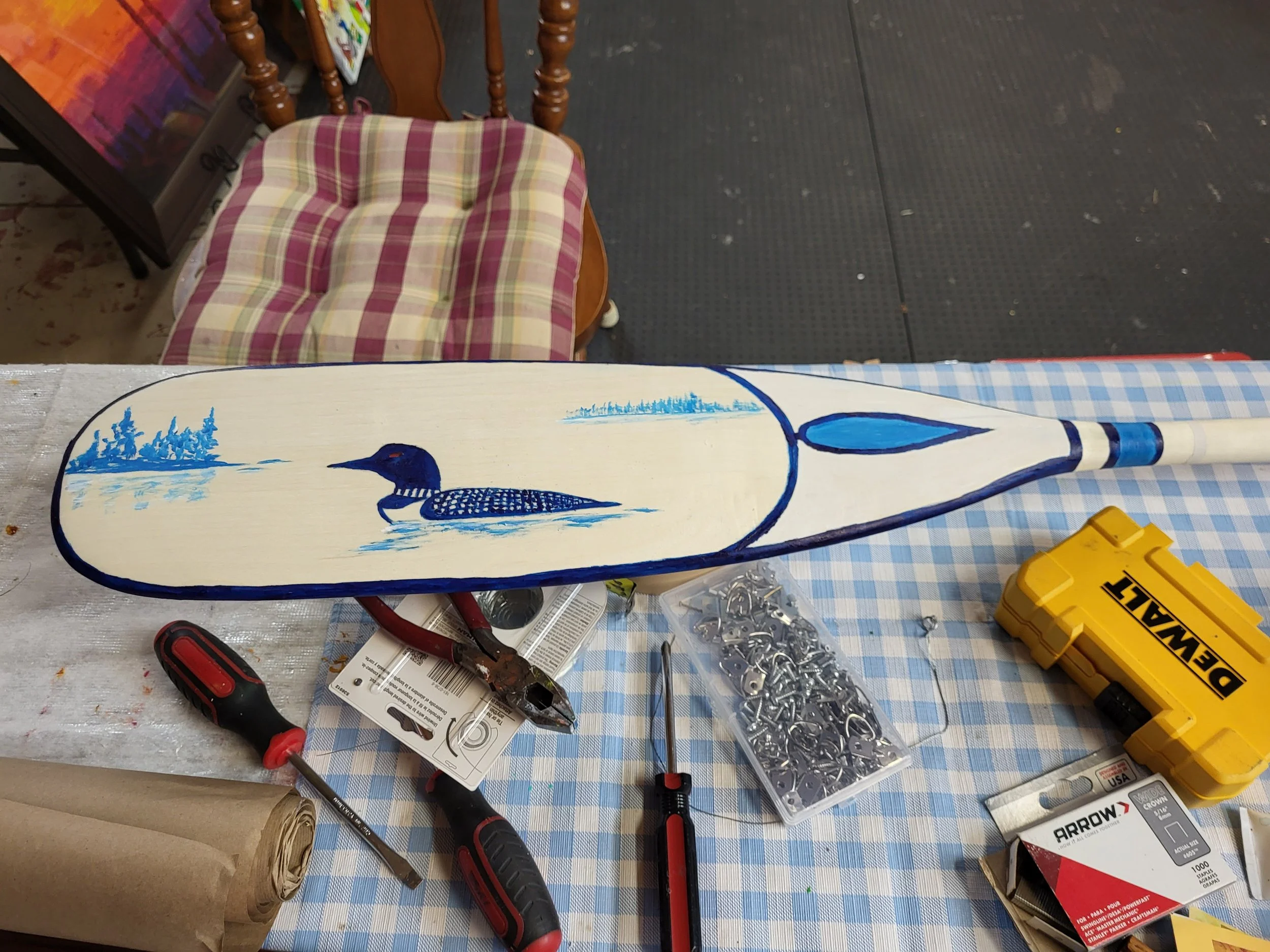 In process.. another loon paddle. Again, trying to paint so they can be hung either vertical or horizontal. My new thing, a mini of the opposite side in the handle area!