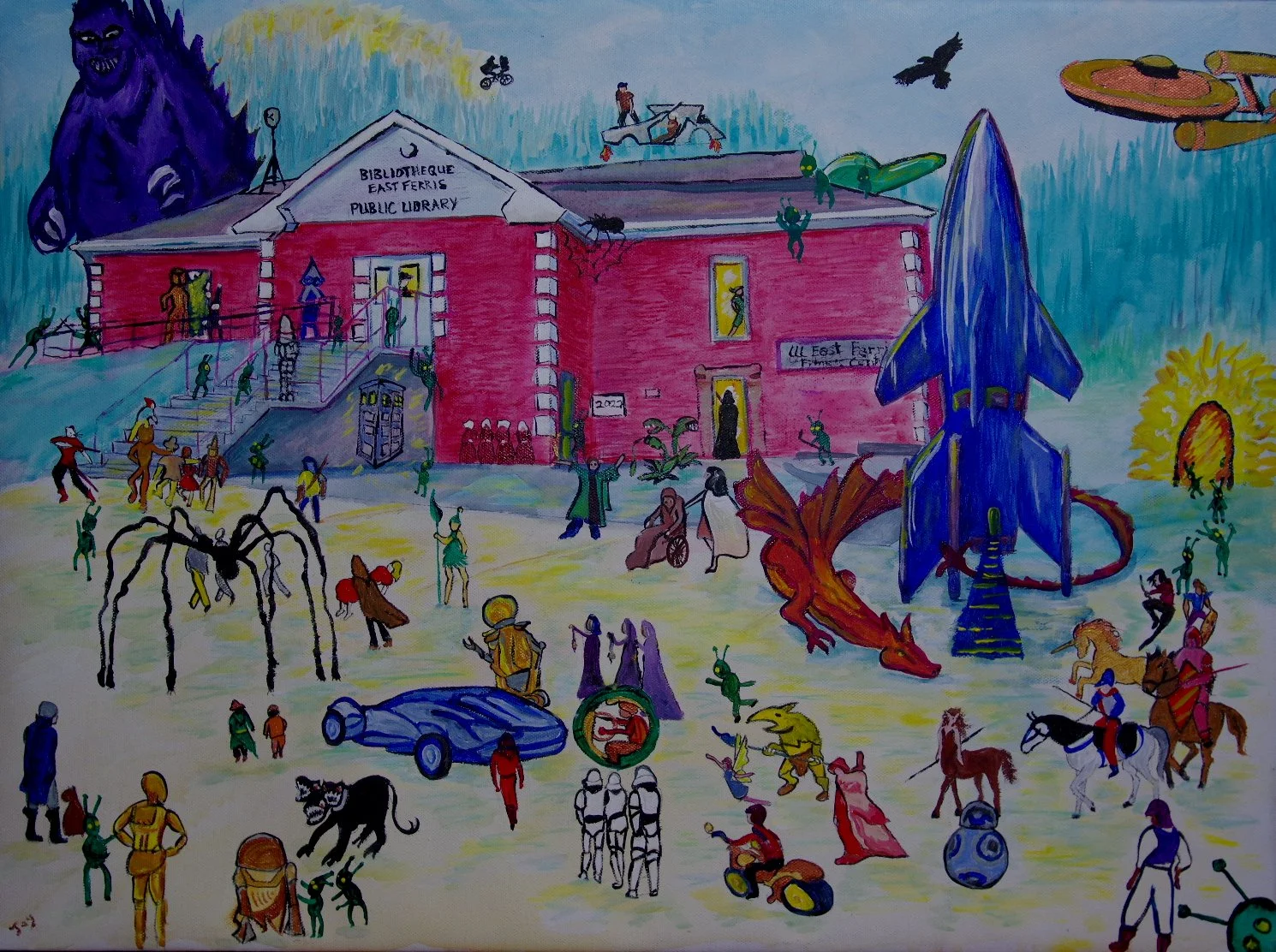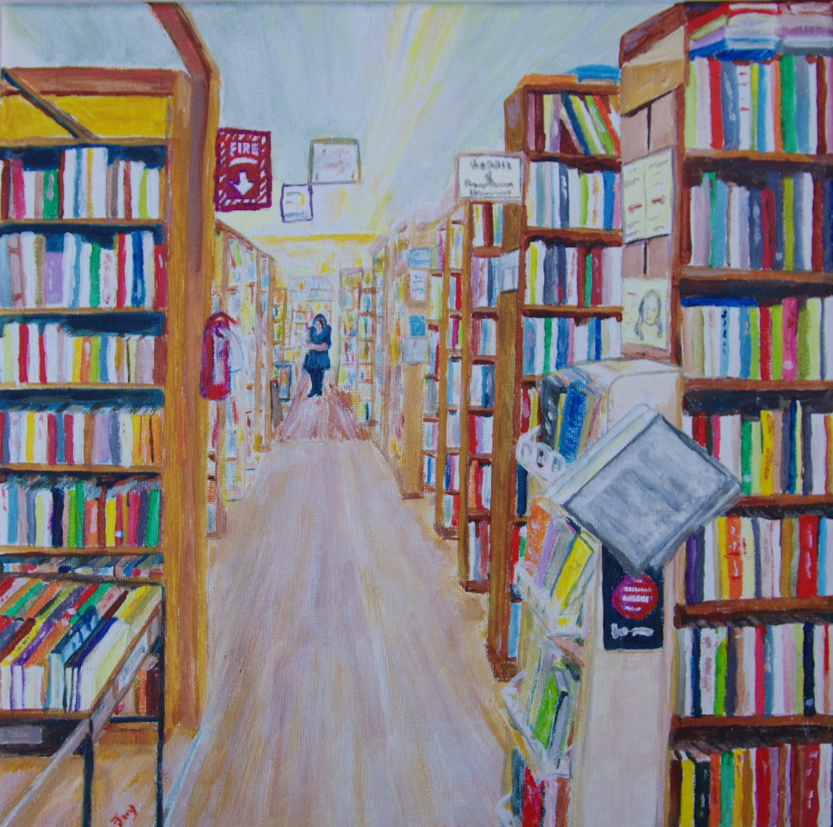 Allison the Bookman Interior - Acrylic 12 by 12 Sold from WKP Gallery North Bay from the 100 years, 100 perspectives show.